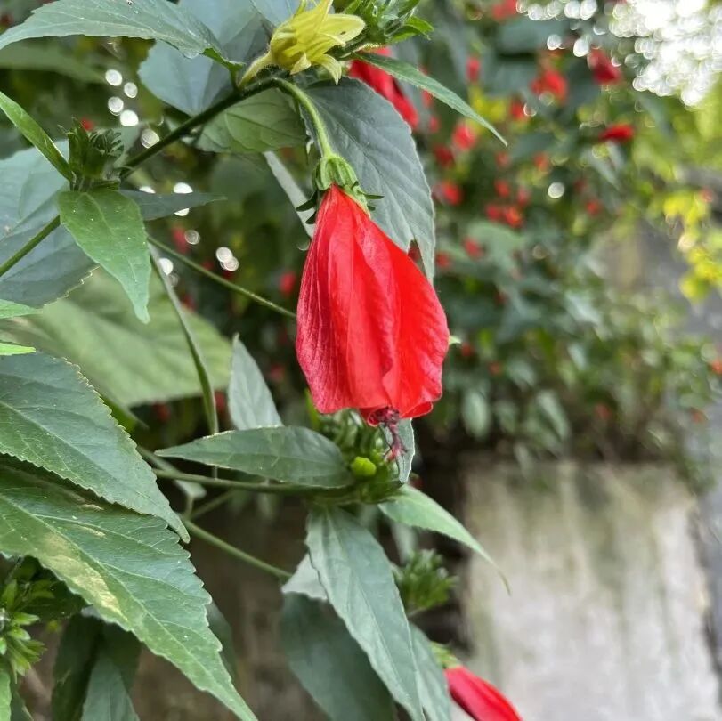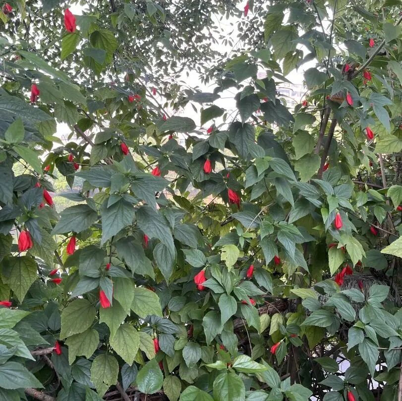垂花悬铃花,别名南美朱槿、灯笼扶桑、卷瓣朱槿。原产于古巴、墨西哥和哥伦比亚。垂花悬铃花的花朵像悬挂在藤蔓上的小风铃,一直是含苞待放的状态,花瓣永远不会打开,因此又被称为永不开放的花。