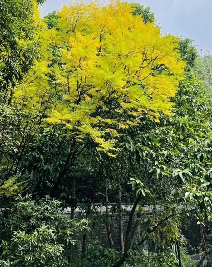 蓝花楹为紫葳科落叶乔木,株高可达15米,性喜阳光充足、温暖湿润的生长环境。其花期在5-6月的春夏之交,花期约20天;冬春之际叶片会变为明艳的黄色,随后细小的叶片随风飘落,形成落英缤纷的景致。蓝花楹能结出比一元硬币还大的果实,挂于枝头,辨识度极高。