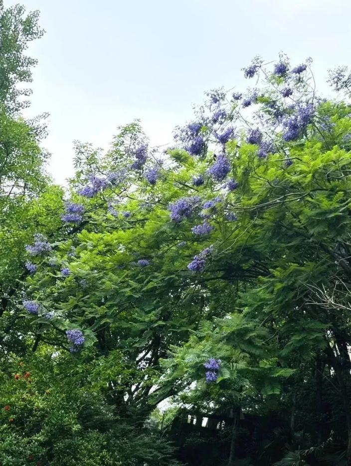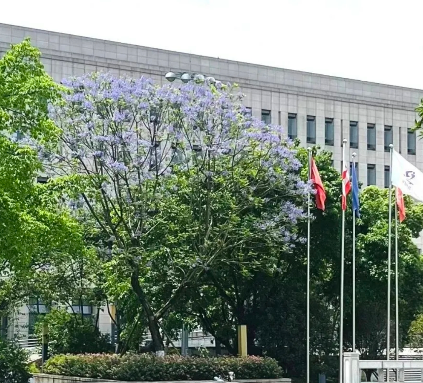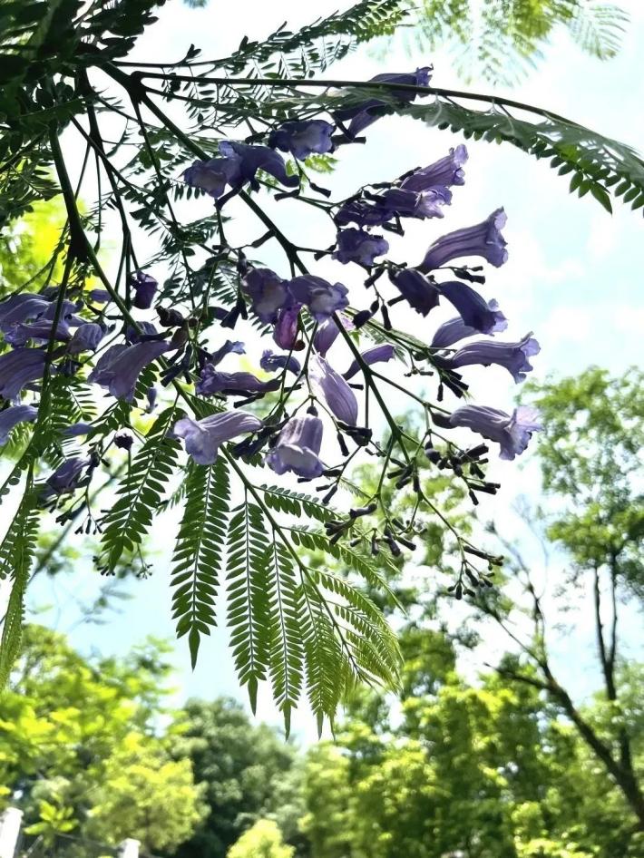 蓝花楹的花朵本为紫色,因植株高大,远观或仰望时便呈现出清新的蓝色调,故得名蓝花楹。花开时节,满树繁花簇拥,如烟似雾、朦胧绰约,亦真亦幻,绚烂至极,也因此有着“蓝色火焰”的美称,成为校园中极具观赏性的特色乔木,为校园景致增添了别样的浪漫氛围。
