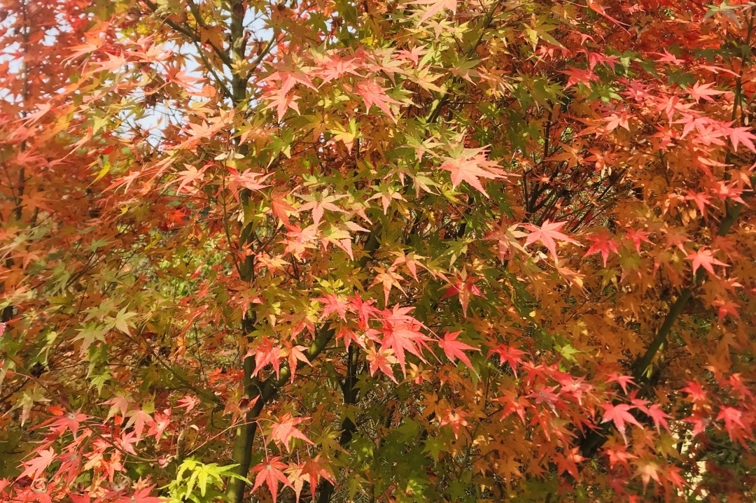鸡爪槭的美,藏在四季的时序更迭里,春发新叶,夏孕花蕊,秋染丹红。春日里,鸡爪槭抽芽展叶,新叶黄绿相间,嫩态盈盈,为校园添上一抹清新的绿意;初夏时节,枝头会悄悄长出淡紫色的小花苞,花苞小巧低调,不惹眼目,整株树木看似普通,却在默默酝酿着秋日的惊艳,也为结出独特的翅果做好准备。