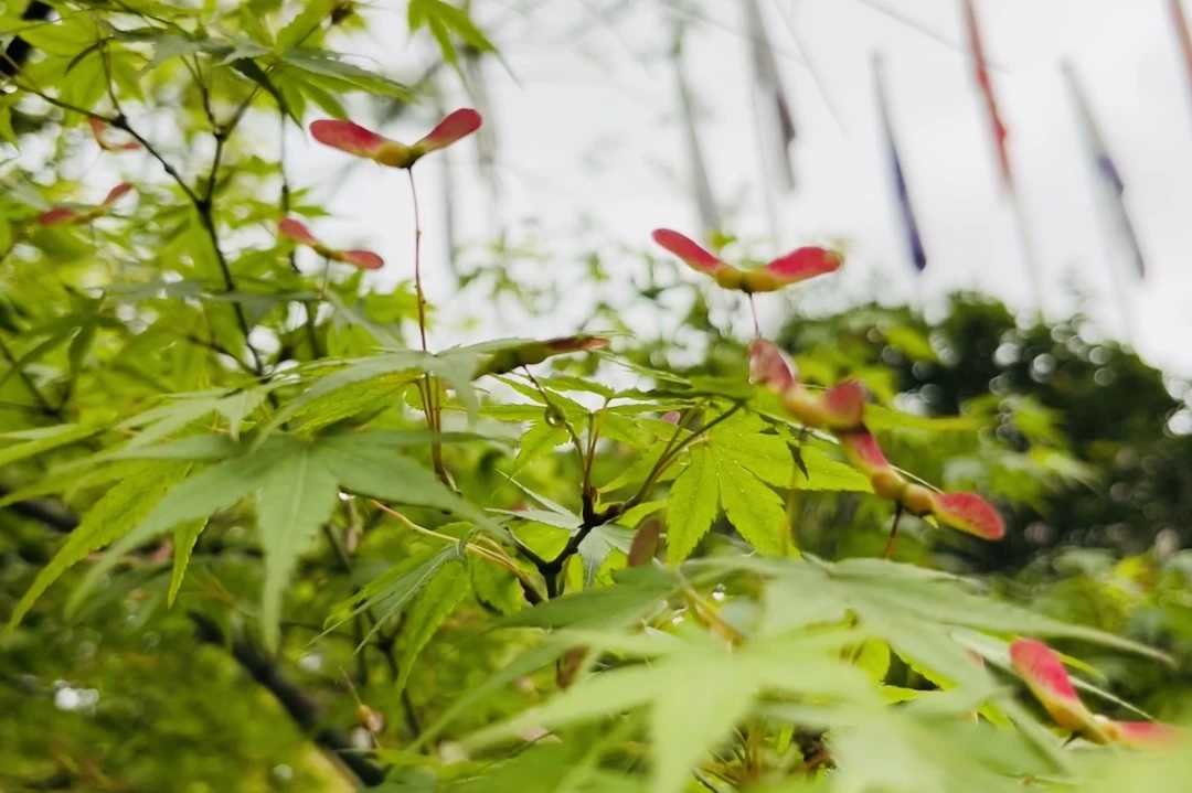 鸡爪槭最具特色的景致,并非秋日艳红的叶片,而是其形似小翅的果实。枝间的翅果呈粉紫色,状如小巧的翅膀,又像灵动的小精灵、待飞的小飞机,一簇簇聚于叶间,仿佛舒展着翅膀即将奔赴远方,模样娇俏灵动,为植株增添了别样的童趣与美感,成为校园里一处别致的自然小景。