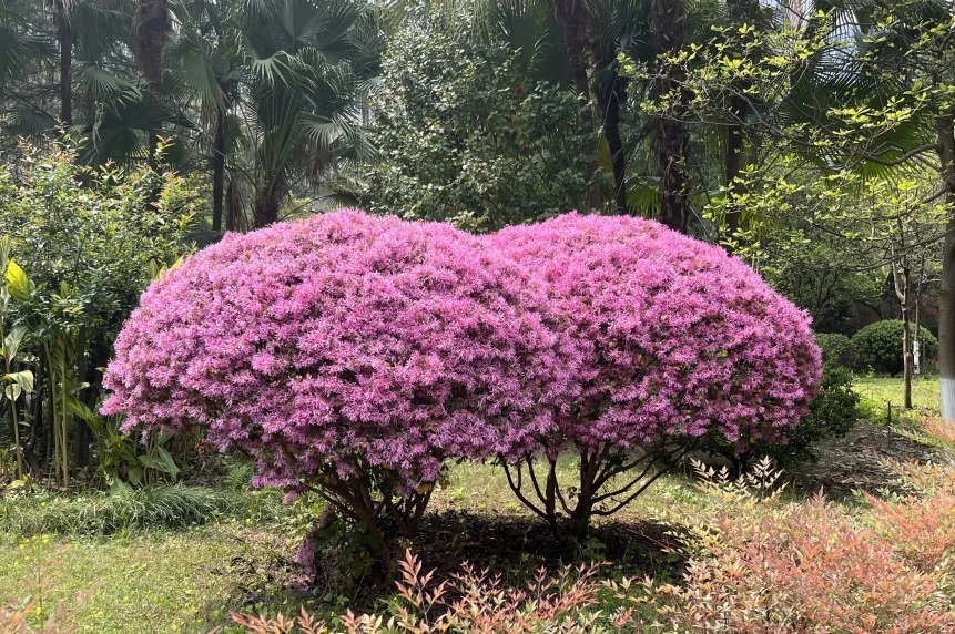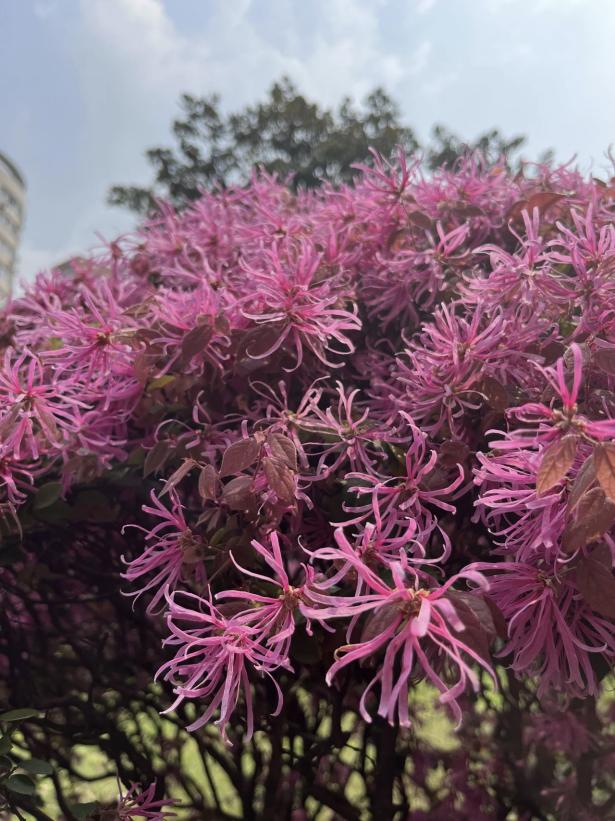 红花檵木是校园中较为常见的绿化植物,遍布校园各处,不开花时以紫红叶片默默装点校园。若想观赏其花团锦簇的盛景,需前往学校南区9教旁边的花园,此处的红花檵木花期时繁花满树,艳红花朵如朝阳般热烈,是校园里独具特色的景致。