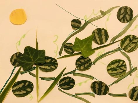 花叶冷水花的叶片形态独特,因酷似西瓜纹路,成为小朋友制作叶子画的优质素材。曾有一年级小朋友以校园南区操场旁樟树下的花叶冷水花叶片为原料,创作了西瓜地、吃西瓜的小姑娘等生动有趣的叶子画作品,让平凡的植物成为童年创意的载体。