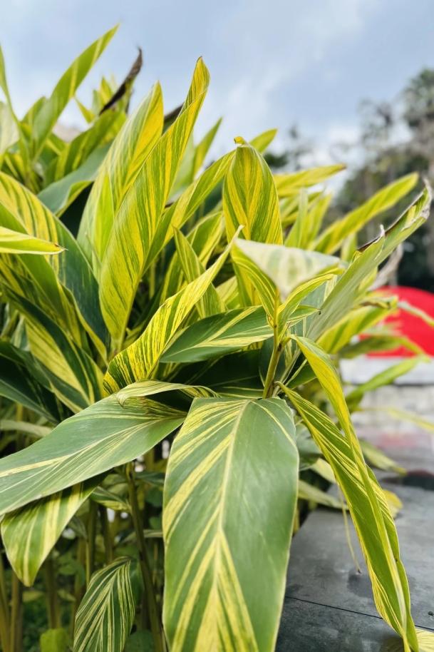 花叶艳山姜,又名花叶良姜,为姜科山姜属多年生草本植物,是山姜属植物的颜值担当。植株最高可达3米,叶片呈披针形、革质状,叶面布有金黄色斑纹,辨识度极高;花期为4-6月,花序自然下垂,花苞绽放前顶端泛红、花体洁白,绽放后花瓣转为黄色,且带有清新香气。其原生分布于我国东南部至南部地区,生长习性喜高热、高湿环境,耐寒性与耐旱性较差,适宜在温润的环境中生长。